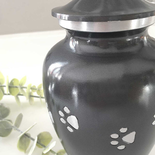 Dog Cremation Urn, Black with a Diamond Cut Silver Paw Print Pattern