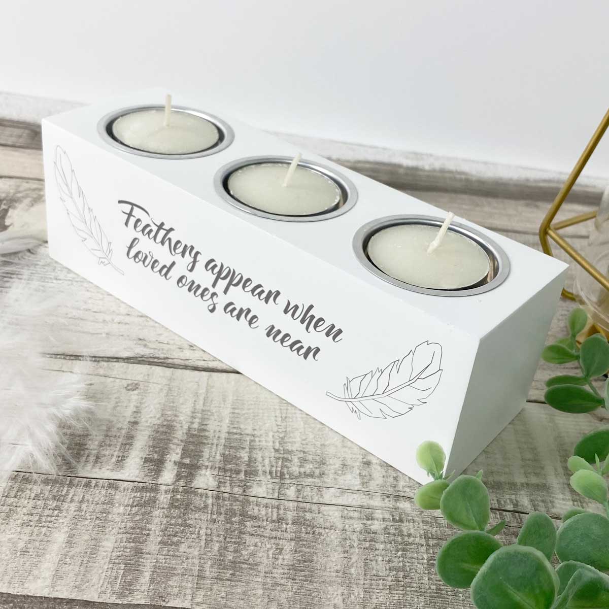 The sturdy tea light holder is made from solid wood and painted white with a high quality smooth finish. It has a the text 'Feathers appear when loved ones are near' and two delicate feathers.