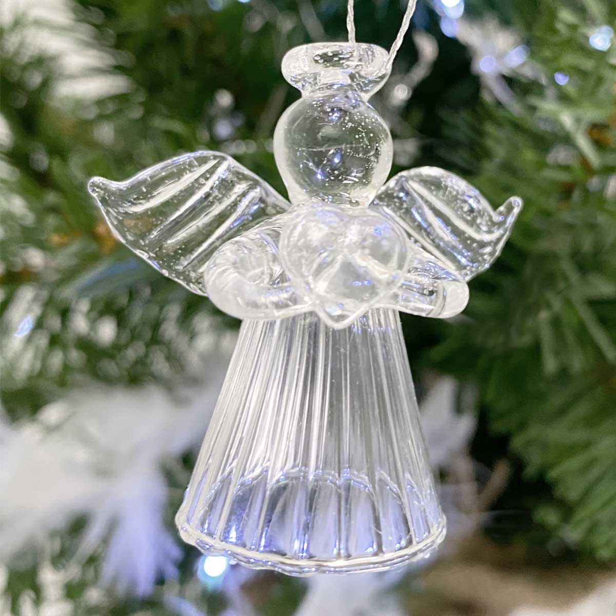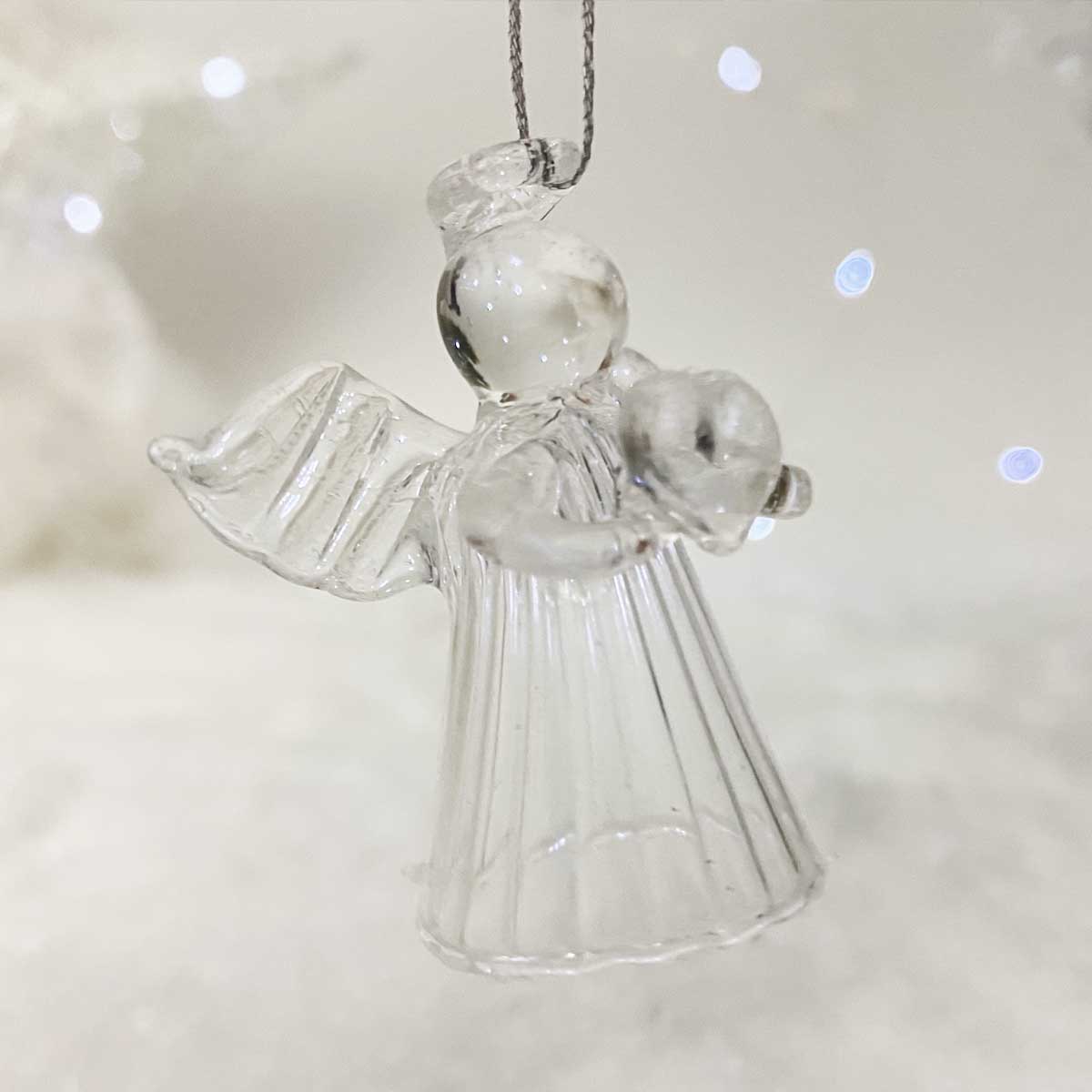 Made from clear glass, with textured robes, the angel holds a heart. Comes complete with silver hanging twine.