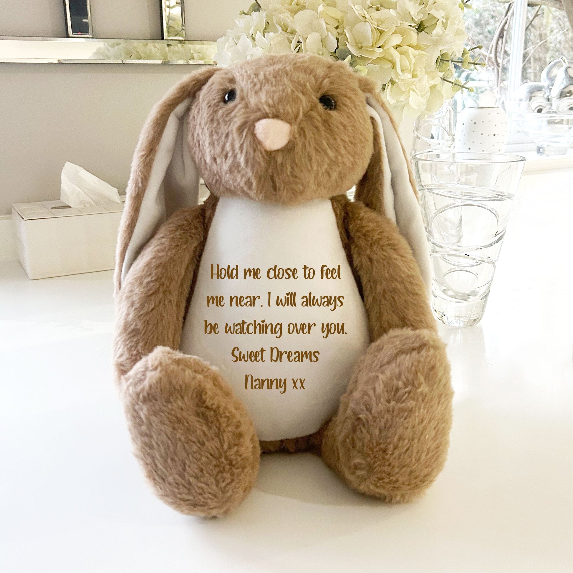 This brown and white bunny is a lovely way to help adults and children alike when they have lost a loved one. Personalised with any message on the tummy, you can also place a small amount of ashes in a metal heart shaped tin hidden inside a pouch at the back of this super soft brown bunny.