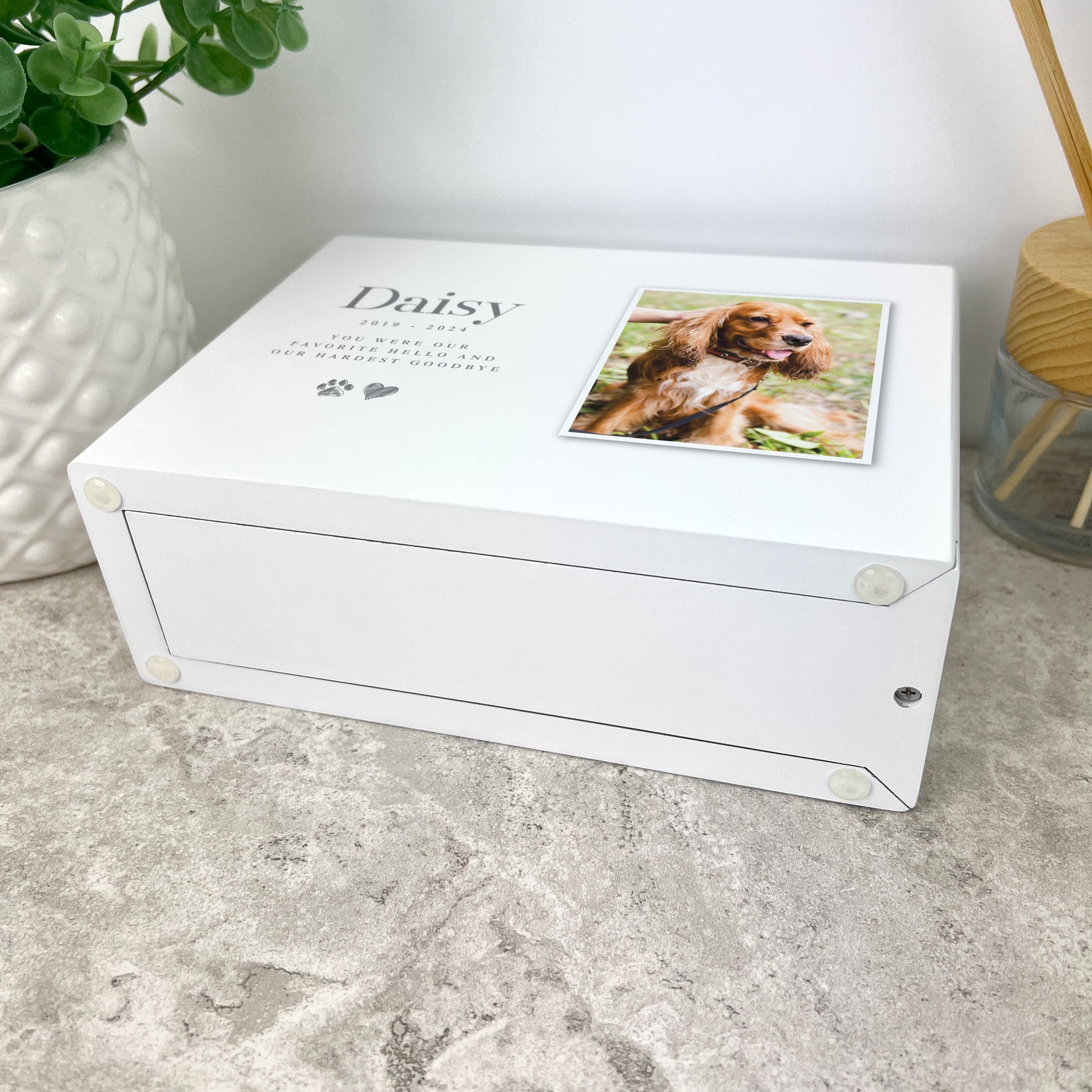 Looking for a pet urn that can be customised with your pets name and your favourite photo of them? Our personalised pet ashes memorial white wooden pet urn is the perfect resting place for your beloved family pet who has sadly passed.