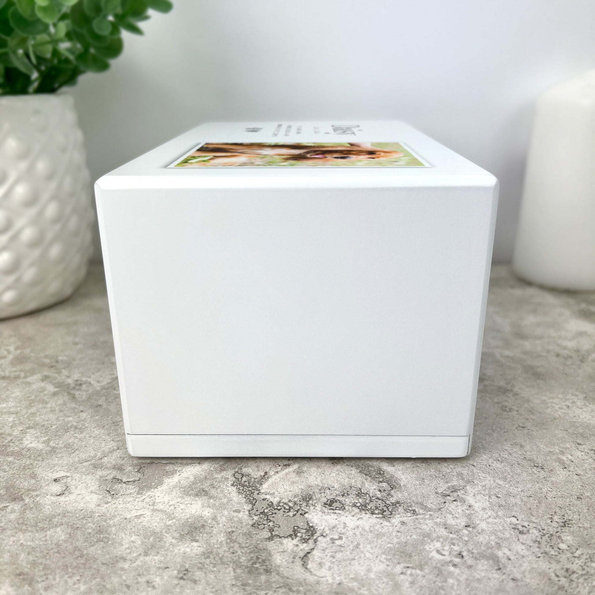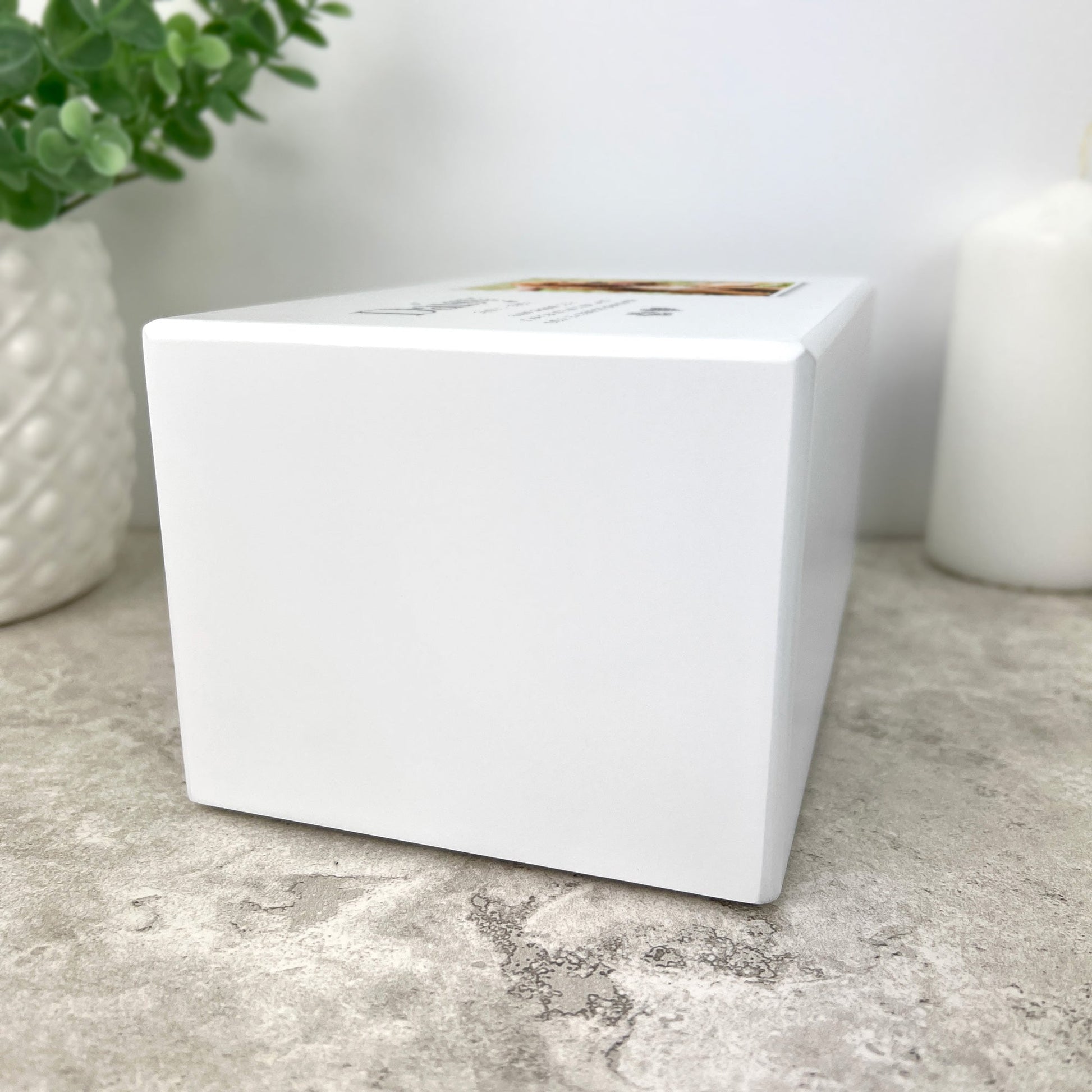 This large modern white wooden pet ashes urn can be personalised with your favourite photo of your beloved pet, along with their name, dates and three lines of any text, with sketched heart and paw print below.