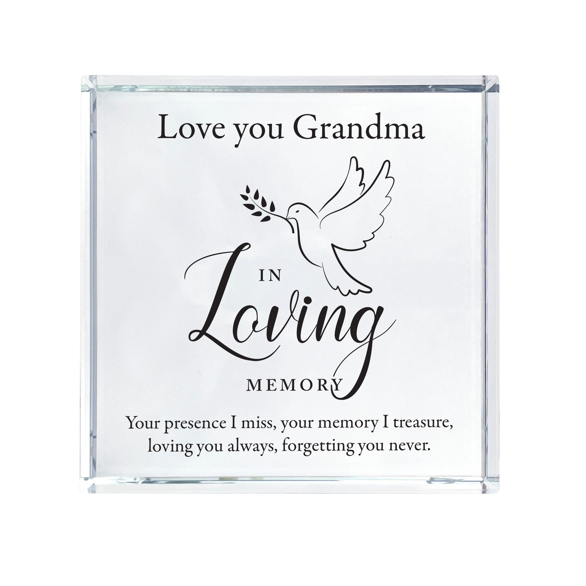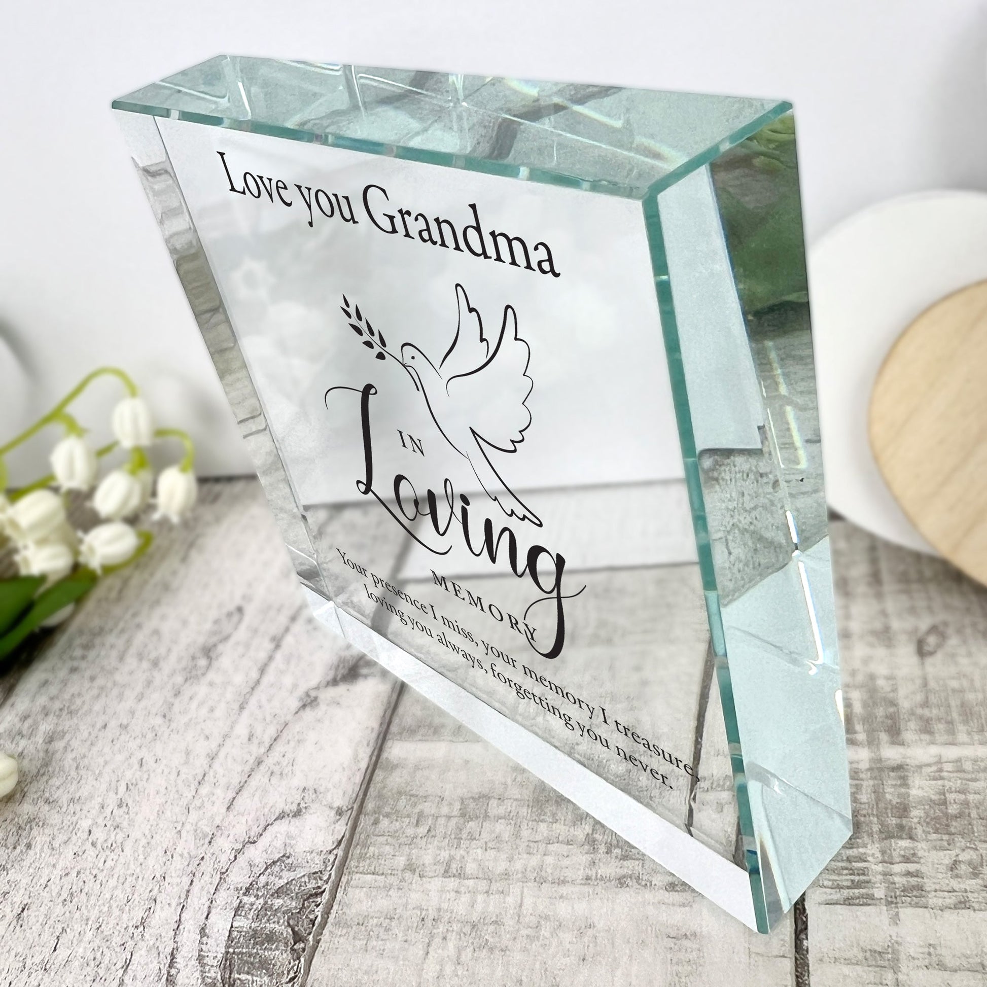 Honour a loved one's memory with a heartfelt keepsake. Our elegant glass token features the 'In Loving Memory' & Dove design, along with three personalised lines of text.