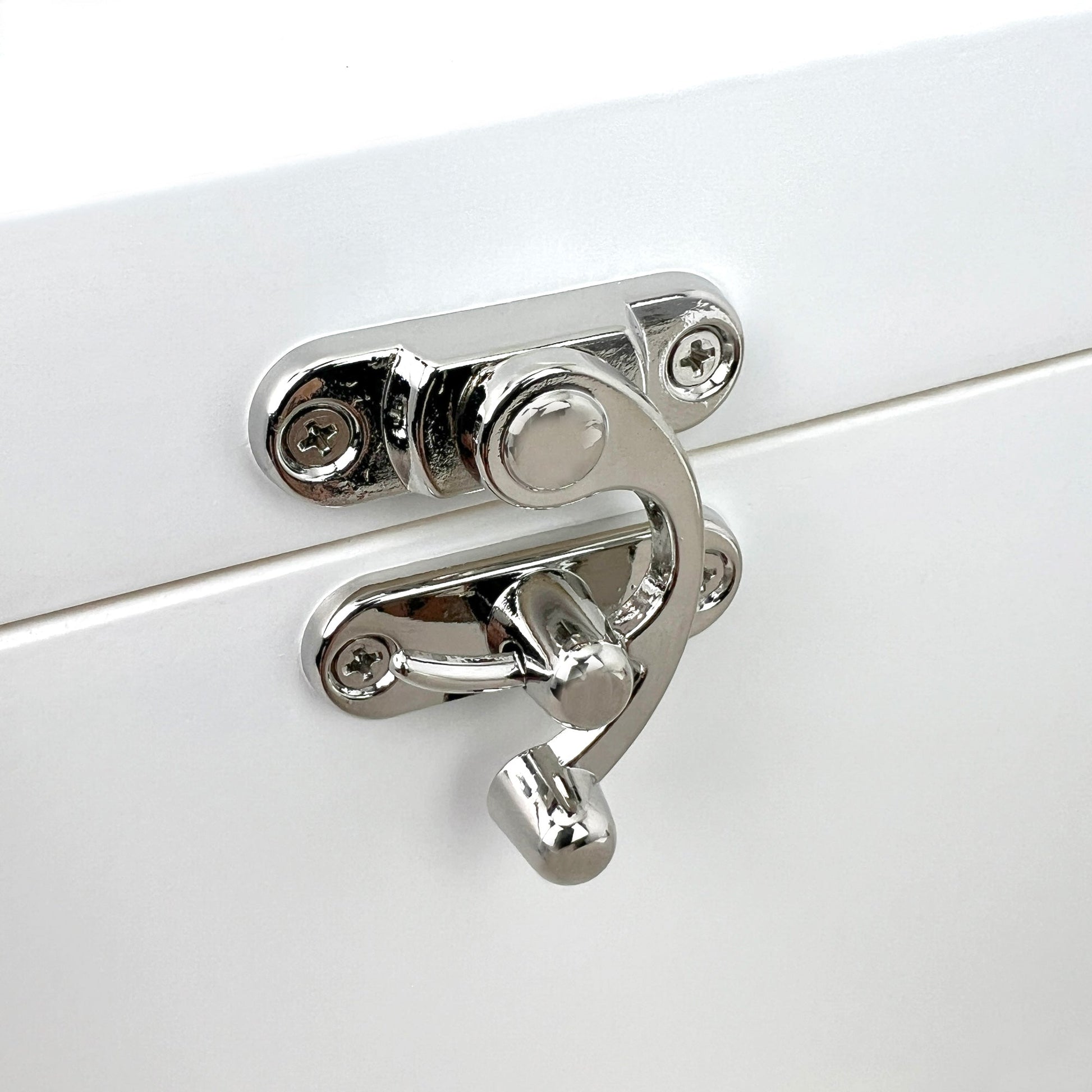 The sturdy wooden box is made from white painted solid pine wood. The boxes have chrome plated metal hinges and an elegant clasp to seal the box ensuring its contents are safe for years to come.