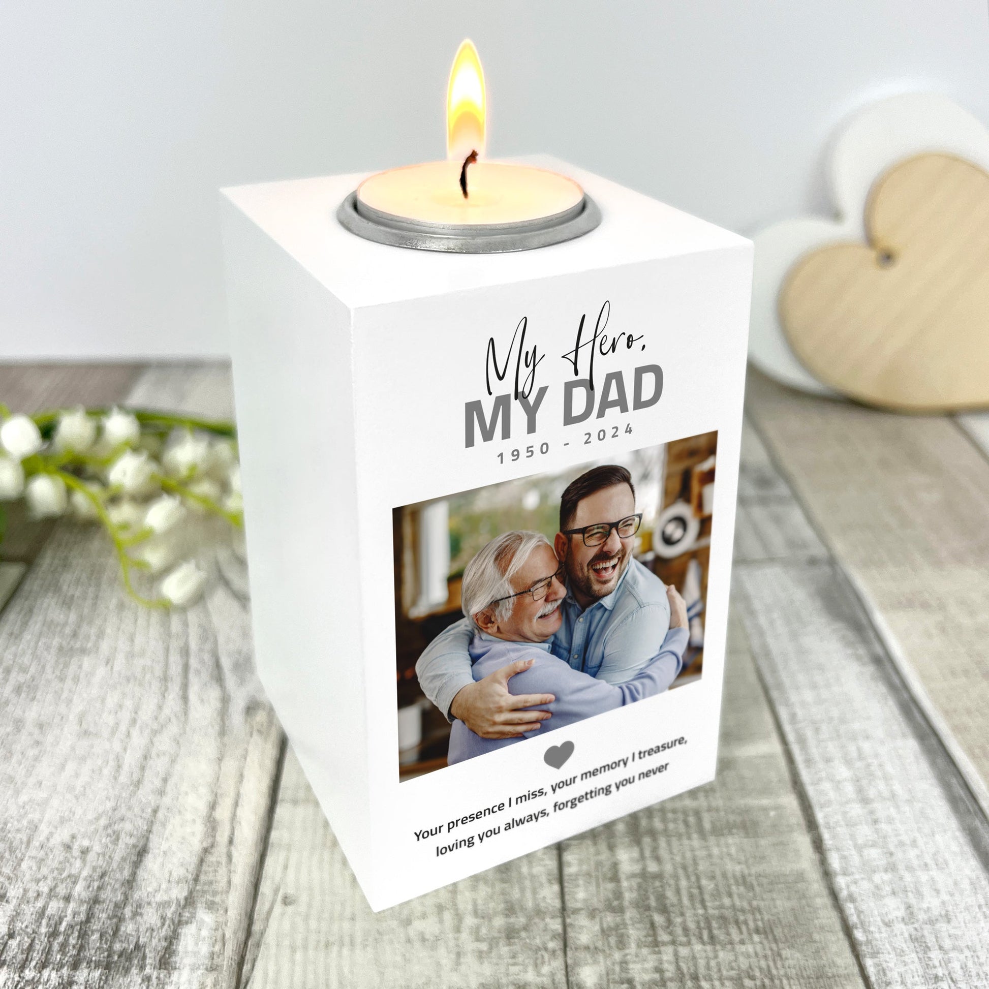 Personalised Memorial Bold Text White Wooden Photo Tea Light Holder