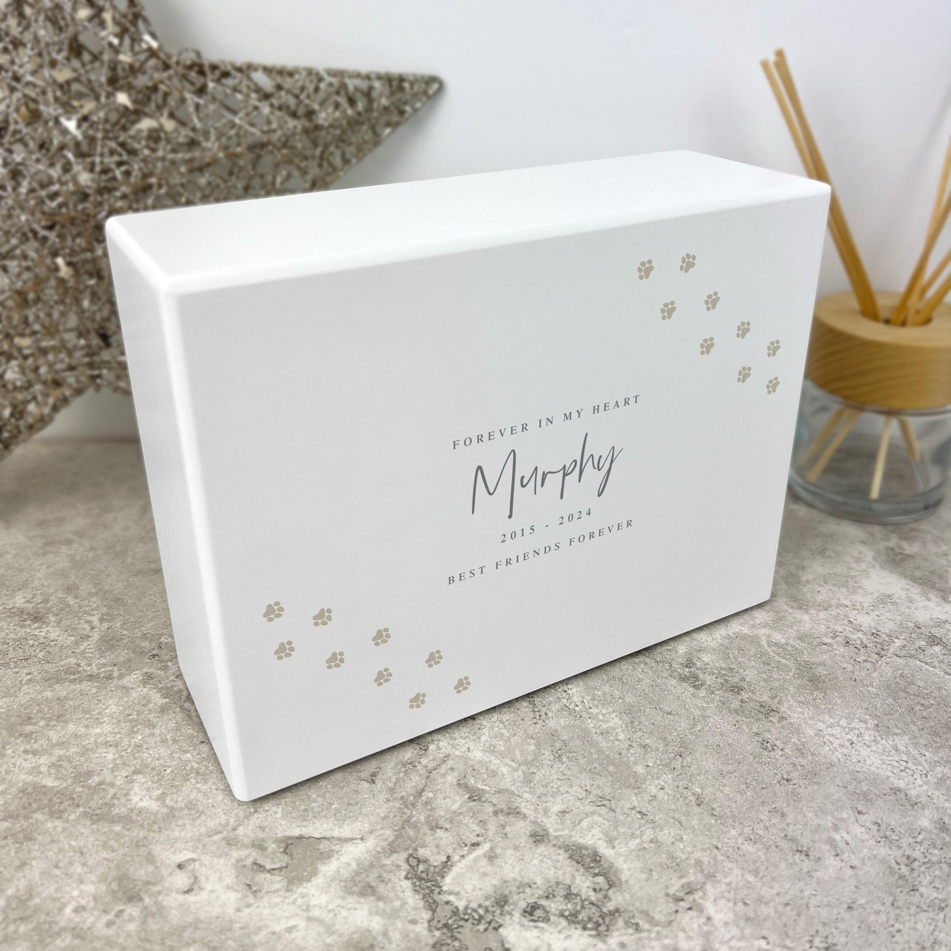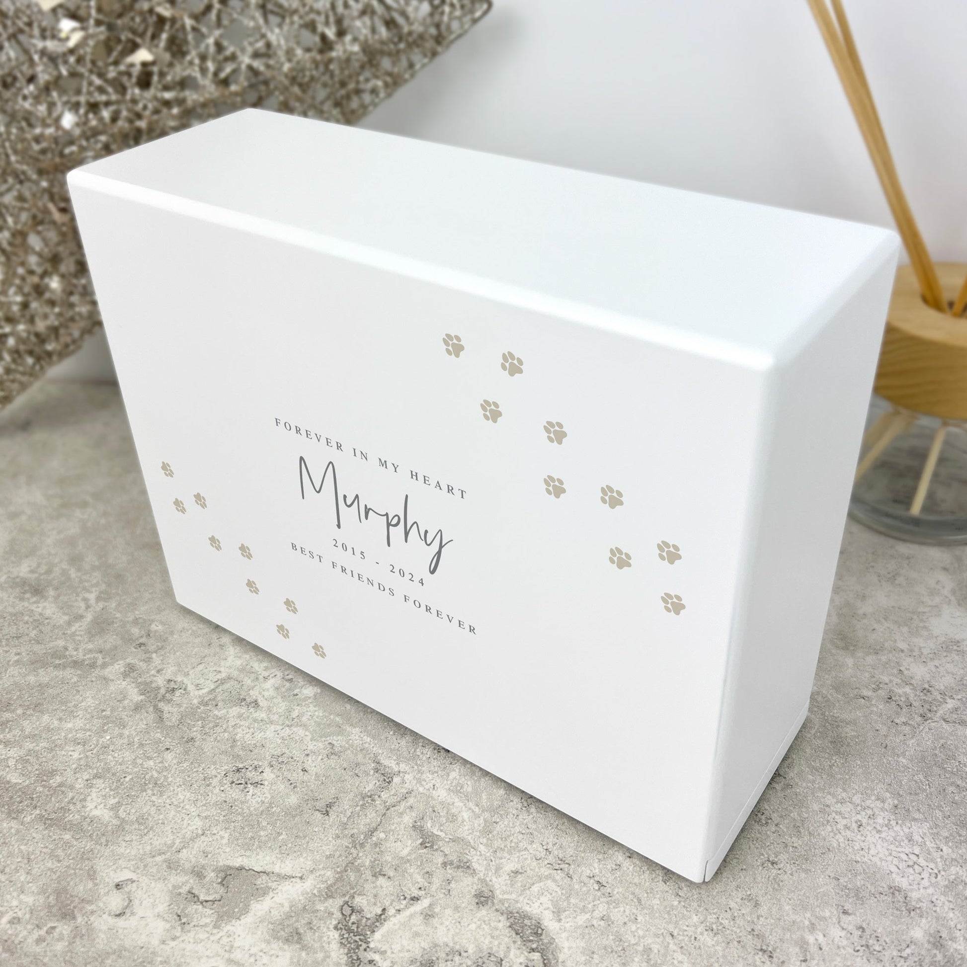This modern looking white pet urn can be personalised with your beloved pets name, dates and two lines of text and has small delicate paw prints running over it. Making this a really special cremation urn for pets ashes.