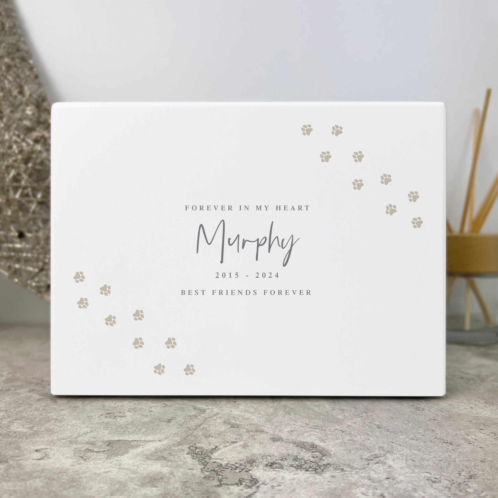 Small delicate neutral paw prints run along the top right and bottom left of this flawless white power coated wooden pet urn, and in the middle is space to customise your pet memorial urn with the below: