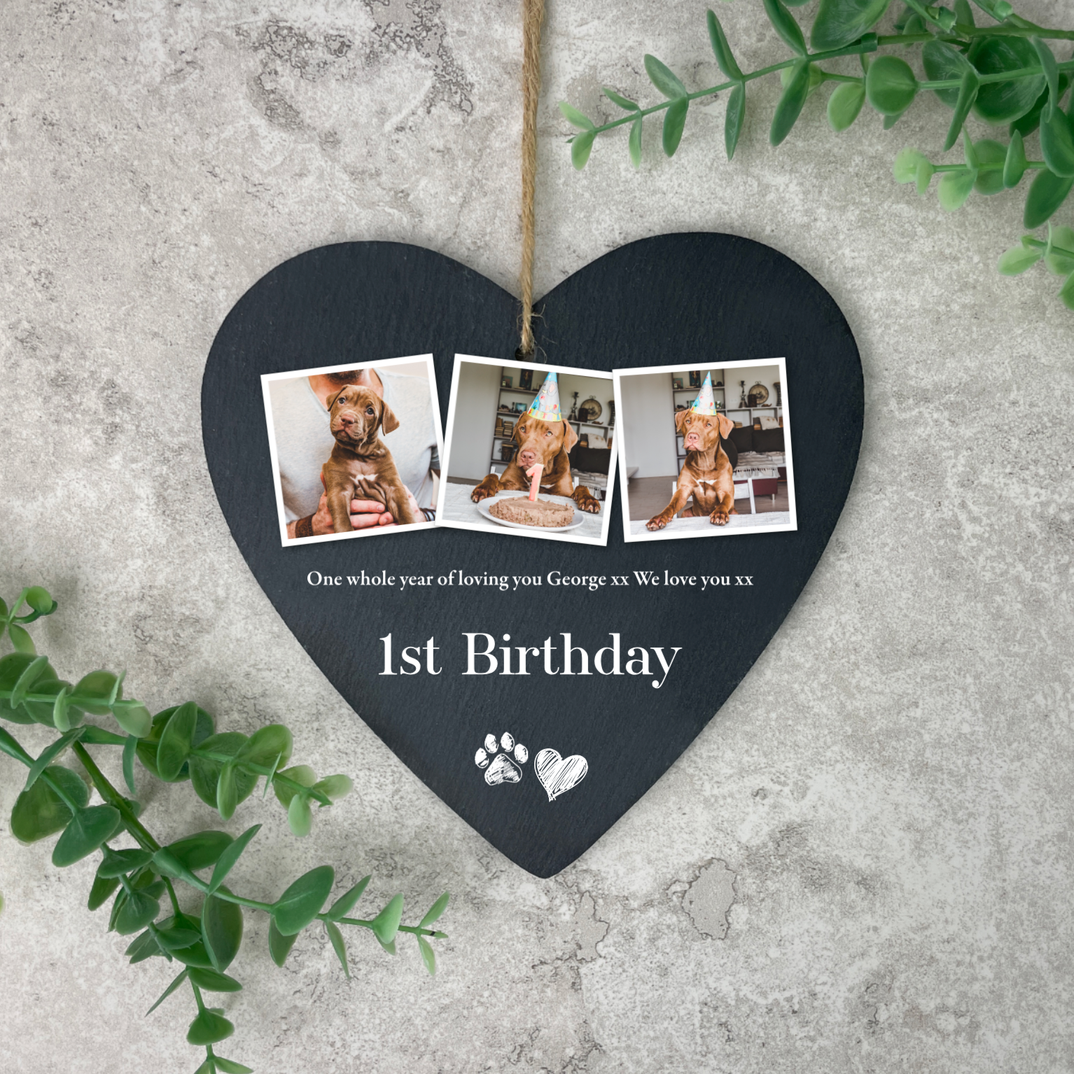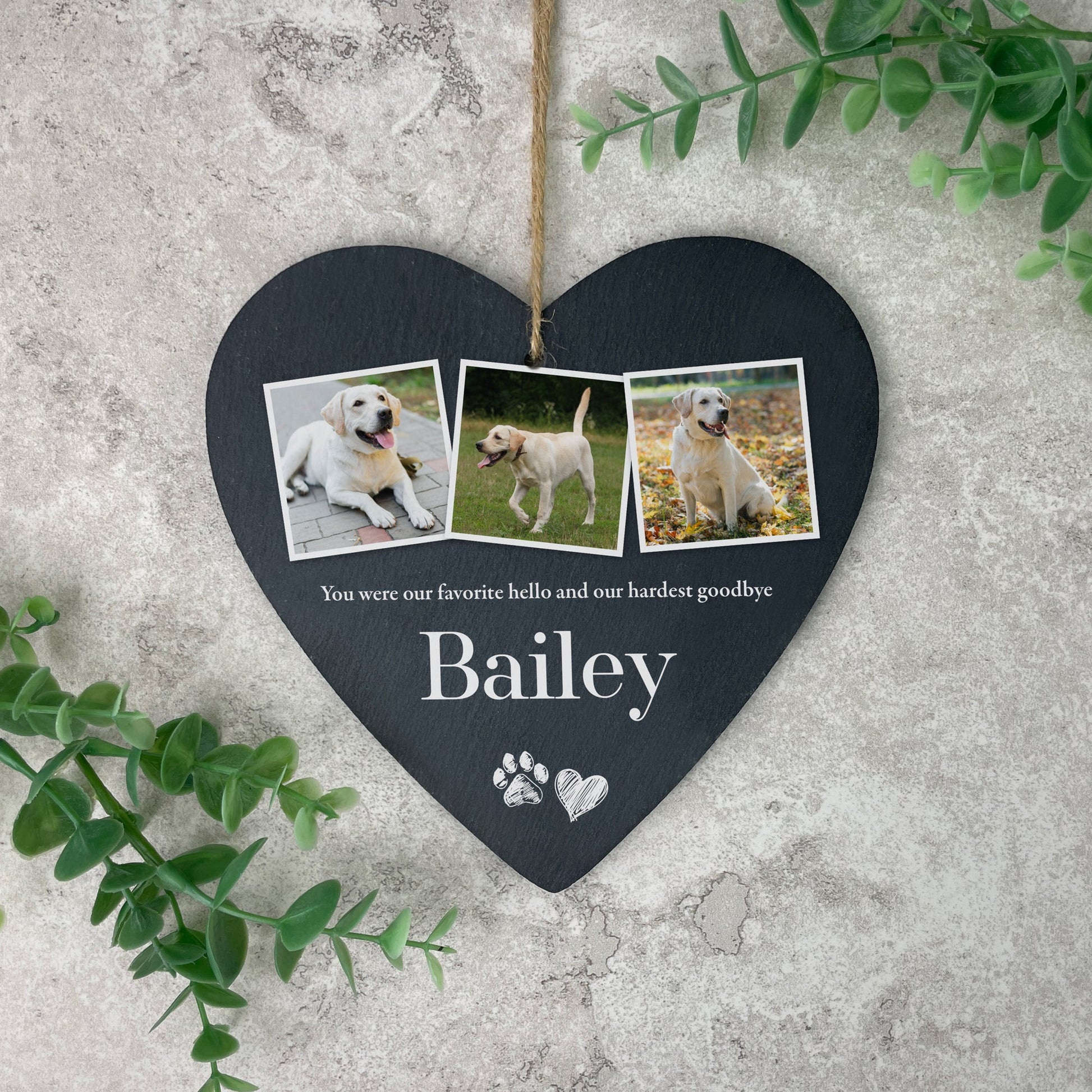 Create a stunning keepsake for your household, yard, or pet's resting place with this personalised heart made out of durable slate. Include three special photos of your beloved furry friend, their name, and a heartfelt message or verse.