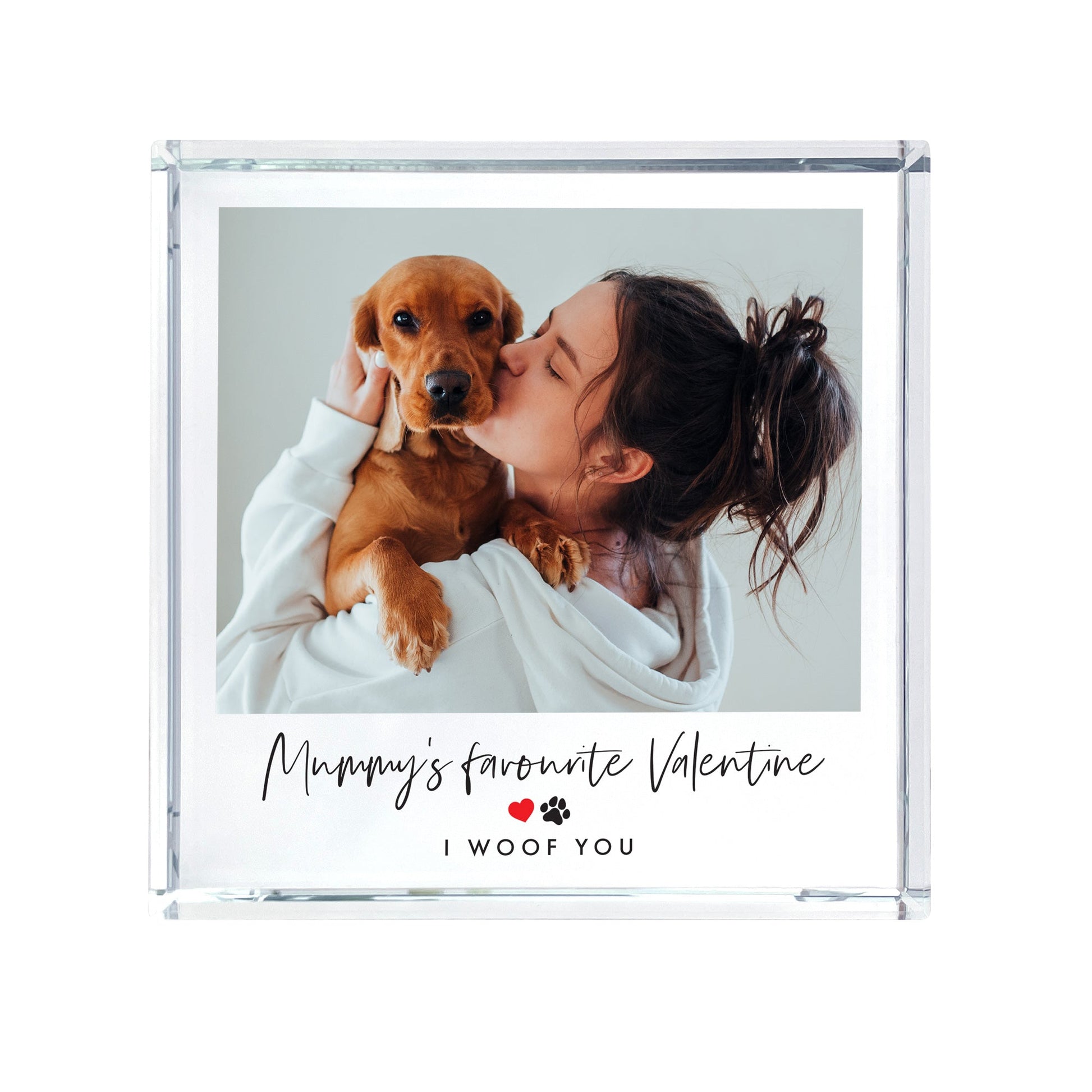 Simply upload your favourite photo and personalise with two lines of text, up to 30 characters on each. The first line (in a delicate script font) can convey your message, while the second line (in uppercase letters) the little red heart and black paw print motif separate the two lines of text.