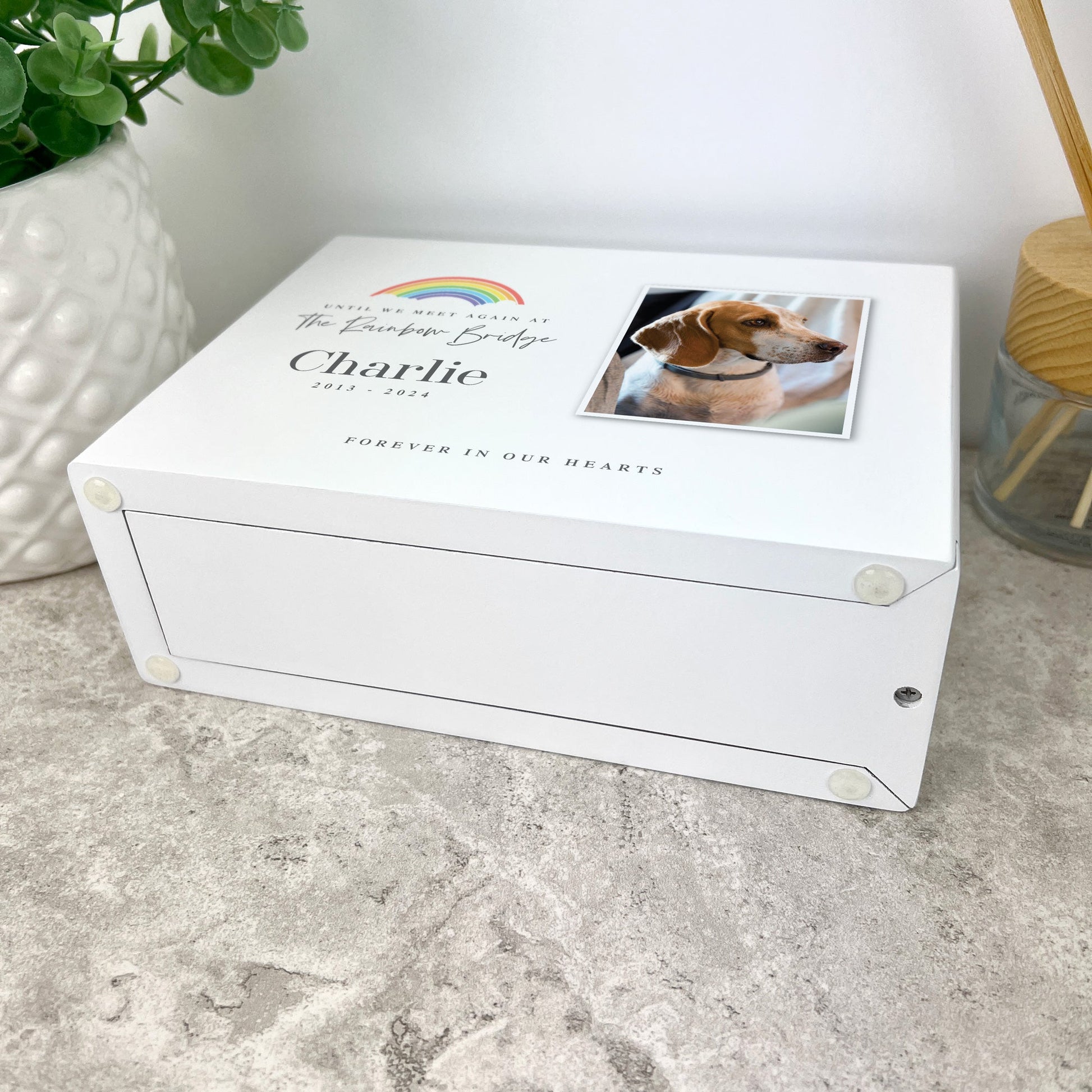 You can customise this white wooden photo memorial urn for pets ashes to create a very special final resting place for your much missed pet. The modern vibrant rainbow design, sentimental verse "Until we meet again at the Rainbow Bridge" and your pets photo and details makes this a really lovely pet memorial urn.