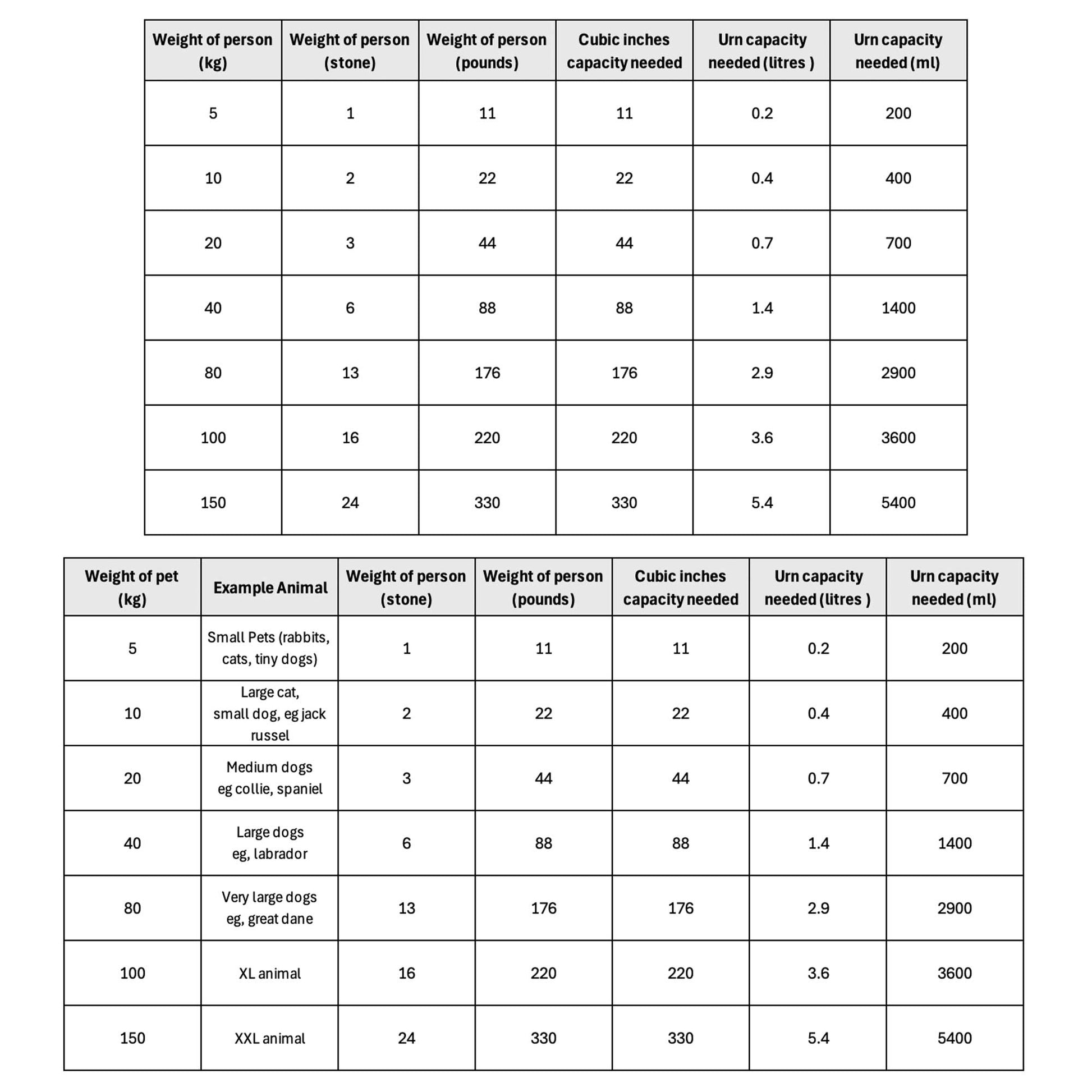 As a guide, the average volume of cremation ashes = 1kg in body weight equates to roughly 35.2ml of cremation ashes.