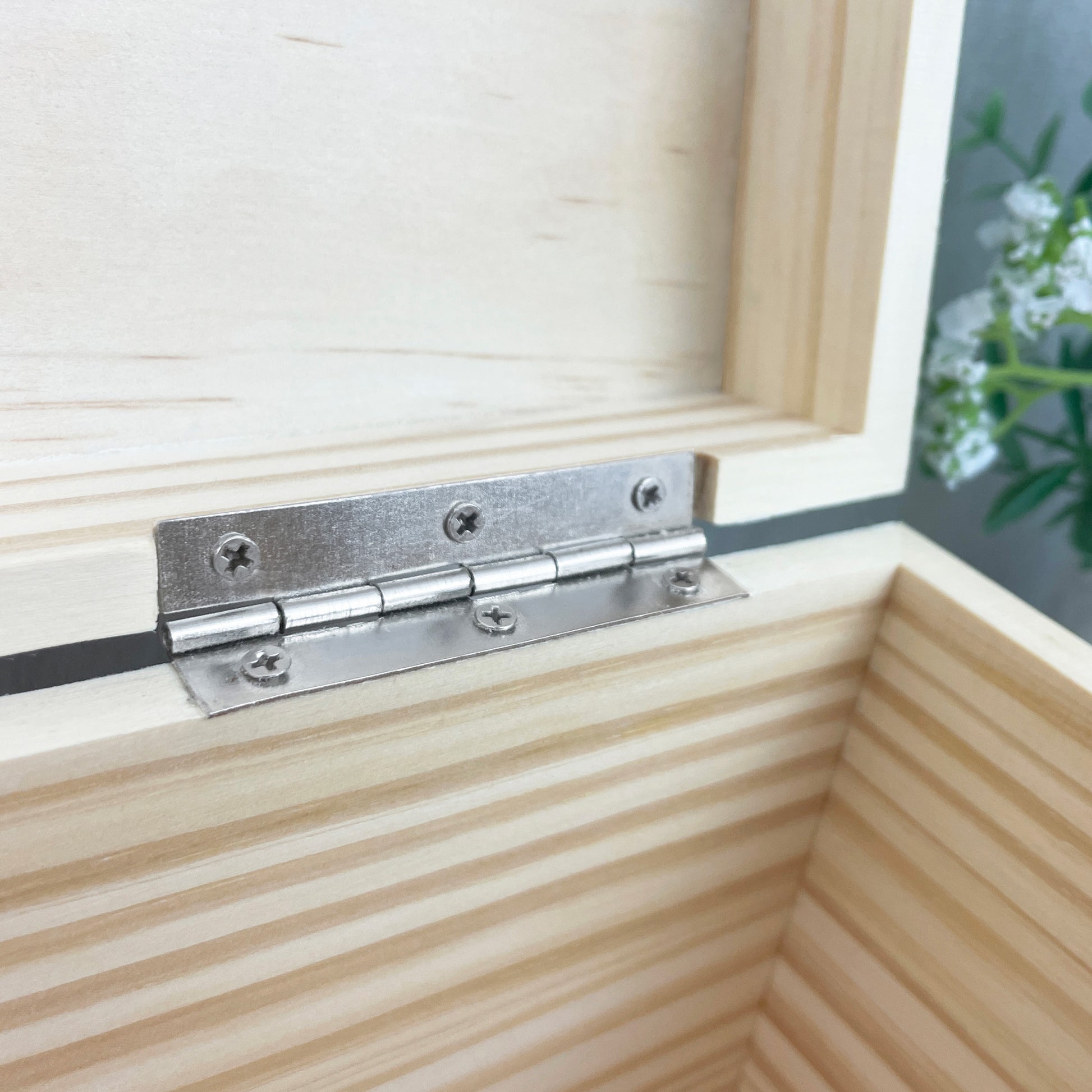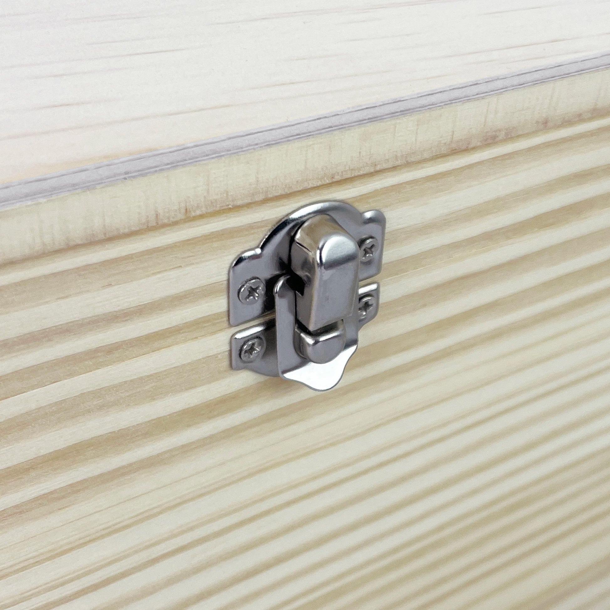 The box is natural pine wood and may have slight imperfections, it has chrome plated metal hinges and a metal clasp to seal the box ensuring its contents are safe for years to come. Box clasp style may vary depending on box size, but will be a silver coloured clasp fastener.