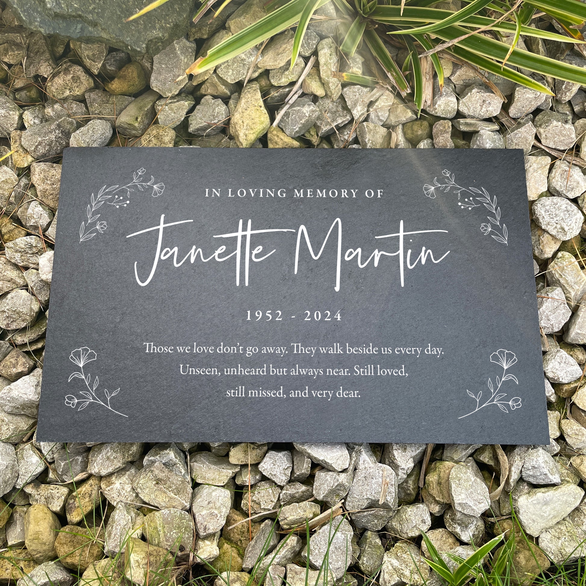 Honour your dearly missed loved one with a personalised slate grave marker. This elegant wreath design includes their name and dates, as well as a heartfelt verse to pay tribute to their memory.